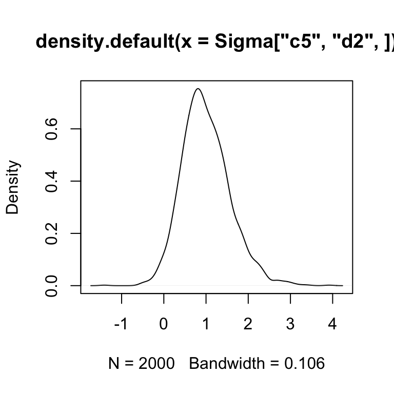 So we see that most of the mass of the posterior is centered on positive values of \(Cov(c_1, d_2)\) suggesting the CLR cooridnates corresponding to these two things are positively correlated.